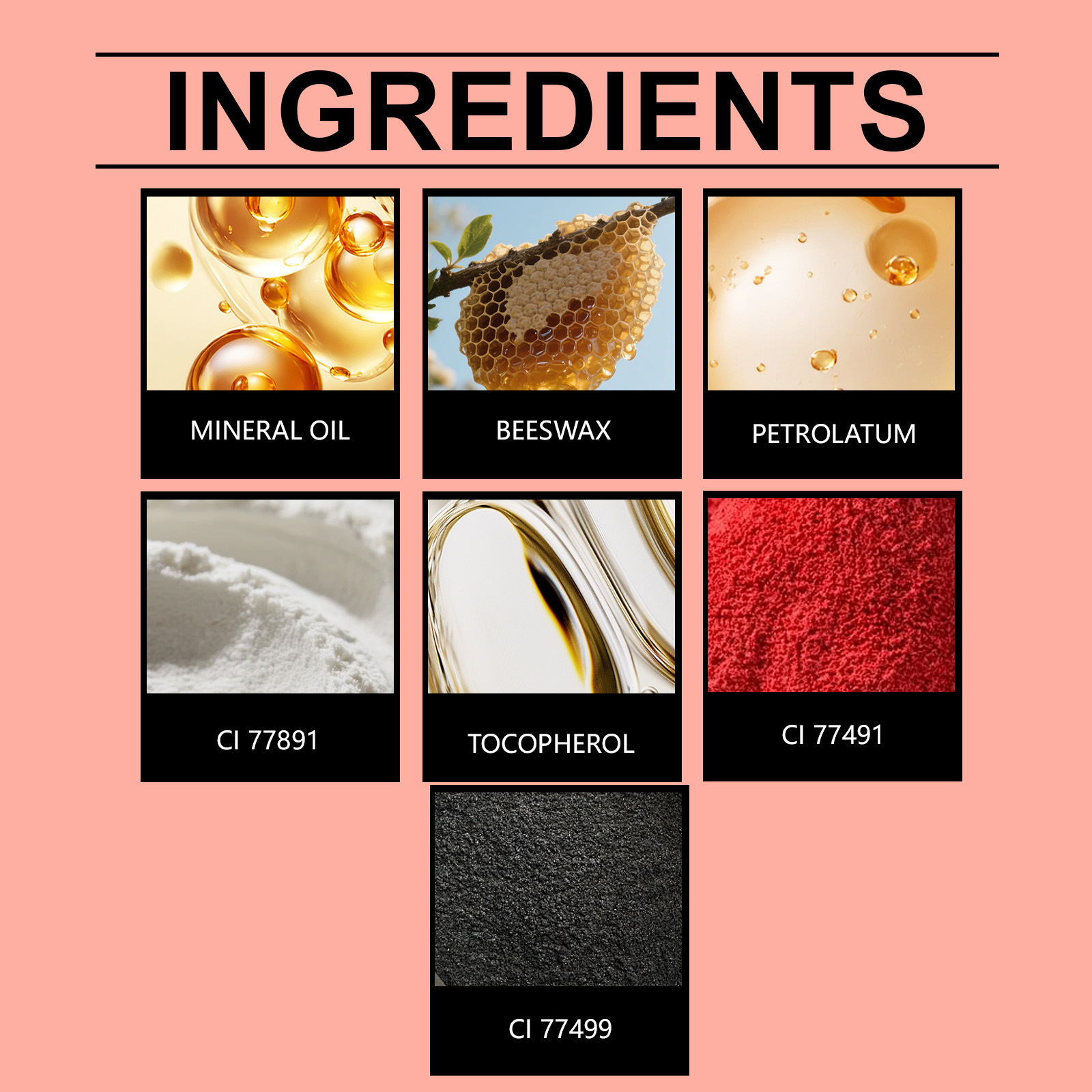 Ingredients: mineral oil, beeswax, petrolatum, CI 77891, tocopherol (vitamin E), CI 77491, CI 77492.